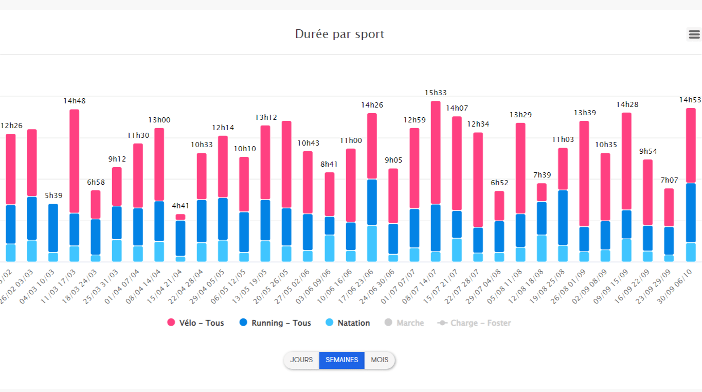 – 55% du temps passé sur le vélo, 31% en course à pied et 14% en natation. Autant de séances de vélo que de séances running.