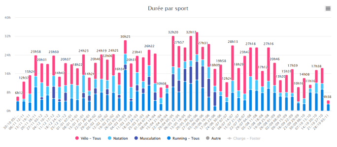 - L’écart-type du volume d’entraînement par semaine est assez élevé compte tenu de 2 facteurs : le temps et l’énergie disponibles à consacrer au sport qui varient beaucoup (la vie d’entrepreneur !) et les qualités travaillées que je fais beaucoup tourner (c’est juste très personnel et pas forcément à reproduire surtout quand on s’entraîne moins de 15h par semaine). Ce n’est pas non plus recommandé de varier autant le volume, le risque de blessure étant alors très fortement augmenté ainsi que les probabilités d’entrer en surentraînement. Je peux me le permettre maintenant pour plusieurs raisons : je dois être pas loin des 10 000 heures d’entraînement triathlon dans ma vie, j’ai été consistant pendant toutes ces années, j’ai pu me bâtir progressivement un corps assez solide pour ne plus me blesser et ce que vous ne voyez pas est que, même si le volume varie beaucoup, la charge (produit du volume et de l’intensité) varie beaucoup moins, ce qui limite considérablement les problématiques évoquées.