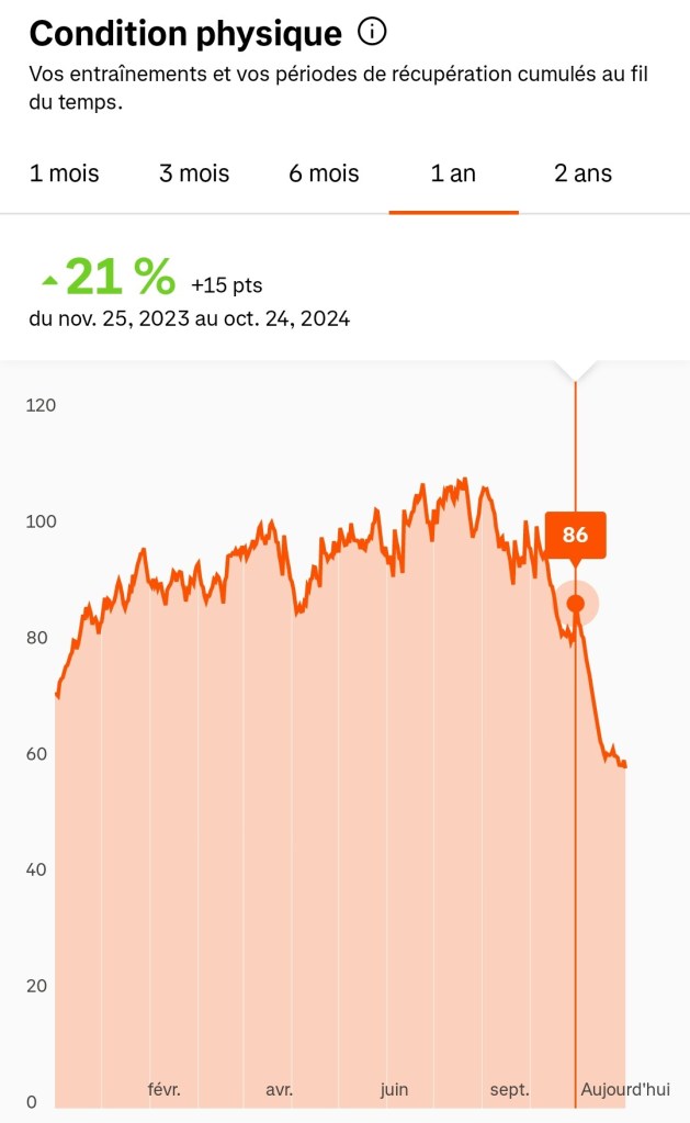 - Axe de progression : tous sports confondus, 88% du temps en Z1 cardiaque (<75% FC Max) MAIS pour le vélo seulement 67% du temps en Z1/Z2 de puissance. Ce n’est pas assez mais c’est à nuancer par les terrains montagneux sur lesquels je roule toute l’année. C’est plus simple d’atteindre 80% du temps dans ces zones d’endurance quand on s’entraîne sur un terrain plat ou peu vallonné. Cependant je vais m’y astreindre en 2025. Il y a tellement de bénéfices à en tirer.