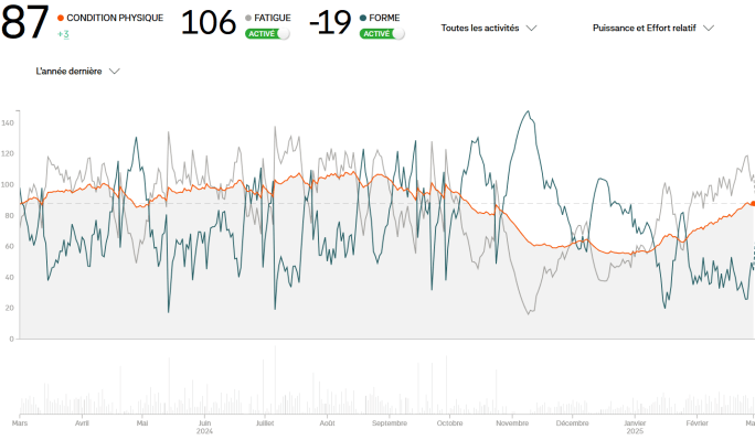 Mais attention : il ne faut pas confondre volume et charge ! La charge prend en compte la durée ET l’intensité de vos séances, c’est donc en général une meilleure mesure de la fatigue que génère l’entraînement. Regarder uniquement le volume permet néanmoins d’avoir un recul sur les périodes où vous avez passé plus ou moins d’heures à l’entraînement comme lors de vacances, de weekends chocs, de préparation spécifique longue distance et d’évaluer approximativement l’équilibre de votre entraînement dans le temps.